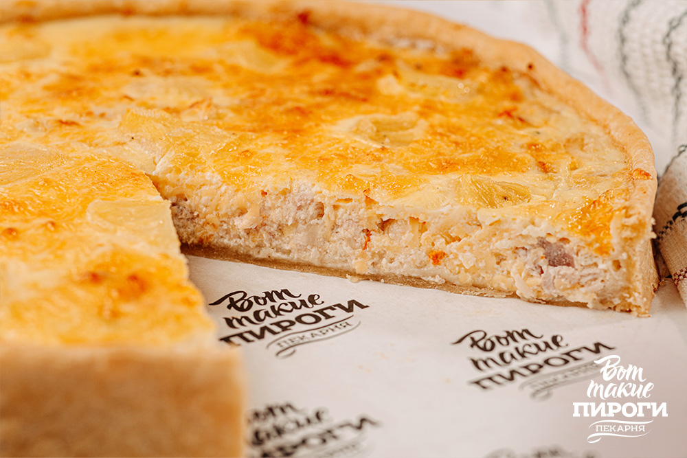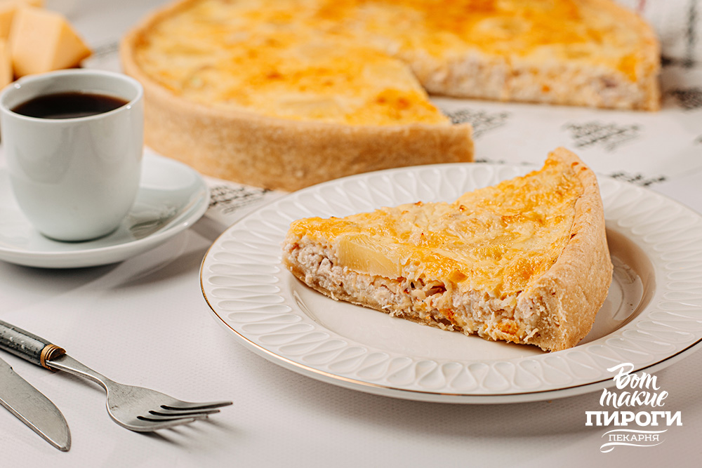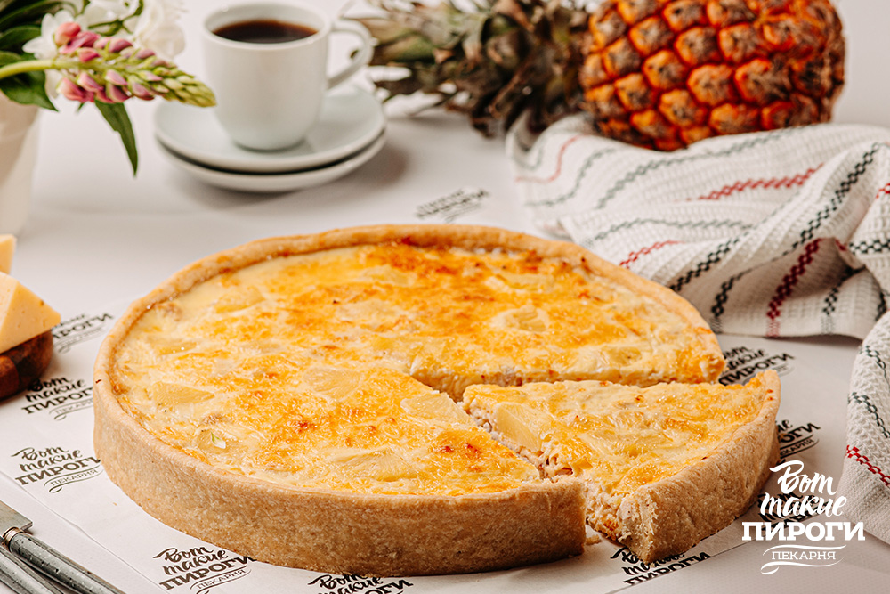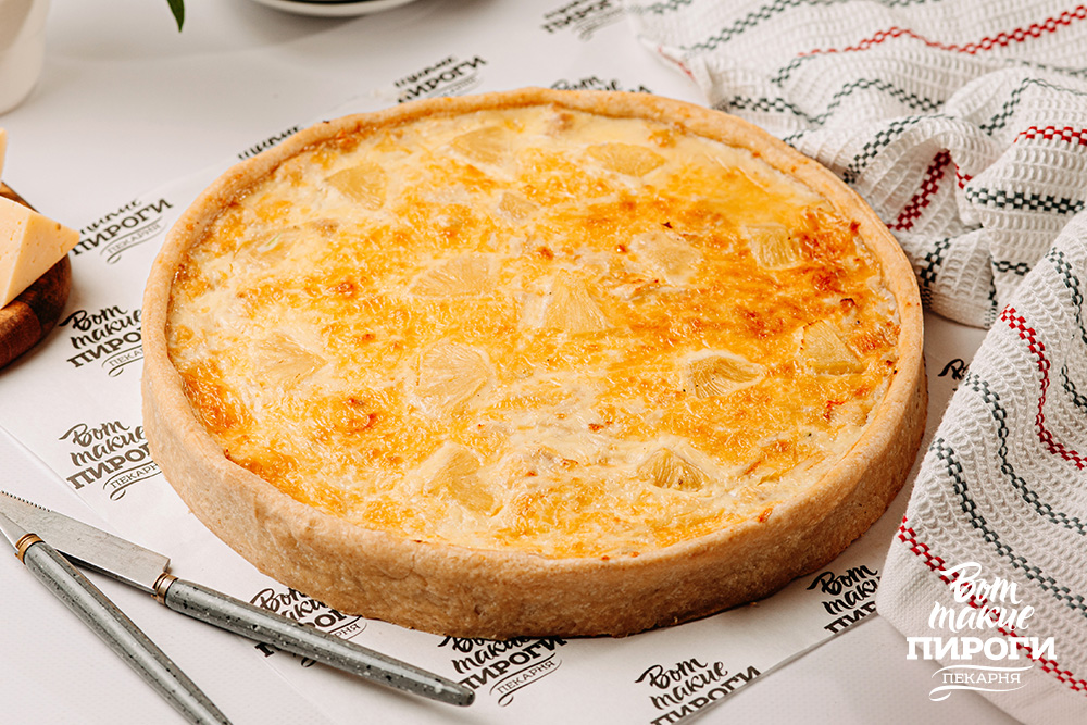 Состав: мука в/с, маргарин столовый, яйцо куриное, соль, филе куриное, грудка куриная копченая, ананасы, лук репчатый, сыр Российский, перец черный молотый, молоко